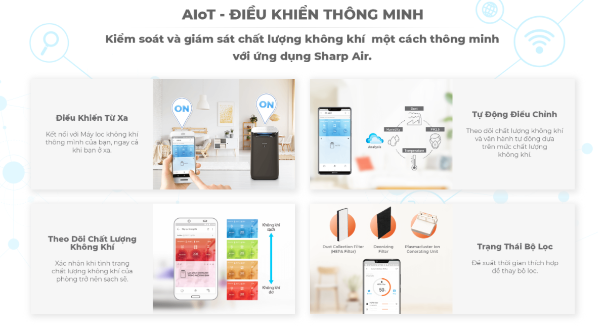 Xu hướng các thiết bị thông minh trong hệ thống nhà thông minh là một xu hướng phát triển cho tương lại. Nắm bắt được xu thế đó, máy lọc không khí Sharp FP-J80EV-H là máy lọc không khí đầu tiên được trang bị công nghệ AIoT (Al trí tuệ nhân tạo và IoT internet vạn vật). Bạn cần điều khiển thiết bị từ xa chỉ cần có smartphone là đủ, hoàn toàn yên tâm khi bạn cần kiểm soát chất lượng không khí ngay cả khi vắng nhà.